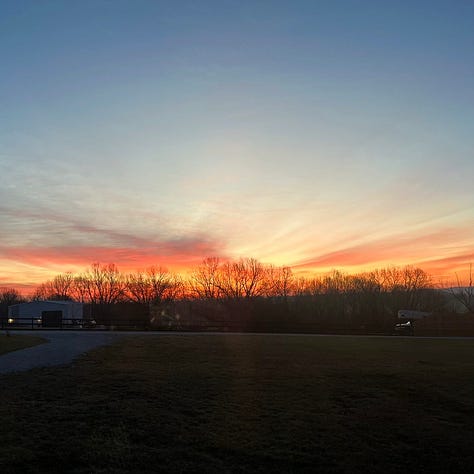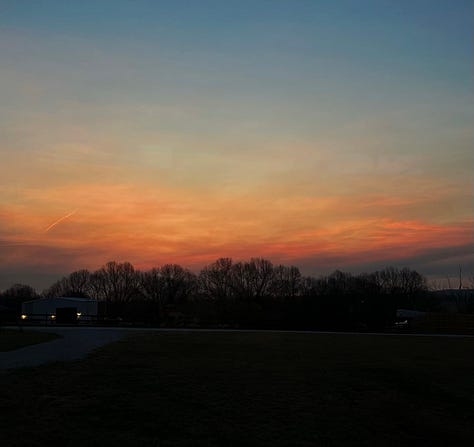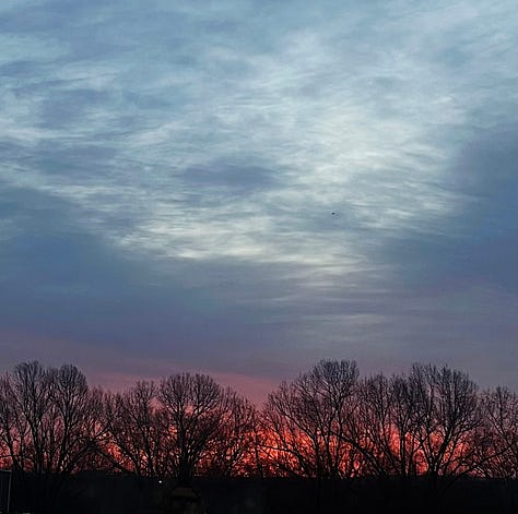 For Lent I have given up sleeping through the dark. Each night, I check the weather app for the exact time of the next morning’s sunrise and set my alarm for 6:30 or 6:42 or 7:01. I make the morning’s coffee by moonlight. I drink my first cup as the pinks and purples spread across the sky. Some mornings the sun rises slow or time slows to give the birds a moment to enjoy it. Some mornings I miss sunrise entirely, usually because I’m looking for my reading glasses. Other mornings the sun hardly rises at all. Or maybe it rises like normal but the clouds toss it into the back of their van.